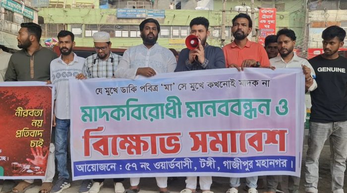 স্টাফ রিপোর্টার : গাজীপুরের টঙ্গীতে মাদকের বিরুদ্ধে সচেতনতা সৃষ্টি ও কঠোর পদক্ষেপের দাবিতে মানববন্ধন ও বিক্ষোভ সমাবেশ অনুষ্ঠিত হয়েছে। স্থানীয় ৫৭ নং ওয়ার্ডবাসী এবং বাংলাদেশ ইয়ুথ রেভ্যুলেশন যৌথভাবে এ কর্মসূচির