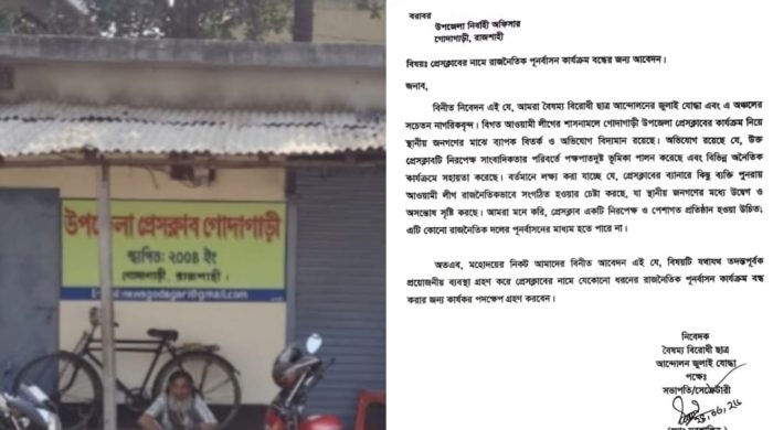 রাজশাহী প্রতিনিধি : রাজশাহীর গোদাগাড়ী উপজেলা প্রেসক্লাবকে বিগত আওয়ামী লীগ সরকারের আমলে ‘আয়নাঘর’ হিসেবে ব্যবহার করা হয়েছে বলে অভিযোগ তুলেছেন বৈষম্যবিরোধী ছাত্র আন্দোলনের শিক্ষার্থীরা। মঙ্গলবার (২৪ মার্চ) বিকেলে উপজেলা নির্বাহী read more