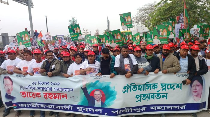 নিজস্ব প্রতিবেদক : বিএনপির ভারপ্রাপ্ত চেয়ারম্যান তারেক রহমানের ঐতিহাসিক স্বদেশ প্রত্যাবর্তন উপলক্ষে রাজধানী ঢাকার তিনশত ফিট এলাকায় অনুষ্ঠিত গণসংবর্ধনায় স্বতঃস্ফূর্তভাবে অংশগ্রহণ করেছে গাজীপুর মহানগর যুবদল। বৃহস্পতিবার (২৫ ডিসেম্বর) সকাল থেকে